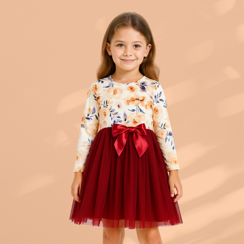 Baby Girls' Floral Long-Sleeve Dress with Tulle Skirt – Thanksgiving Dress