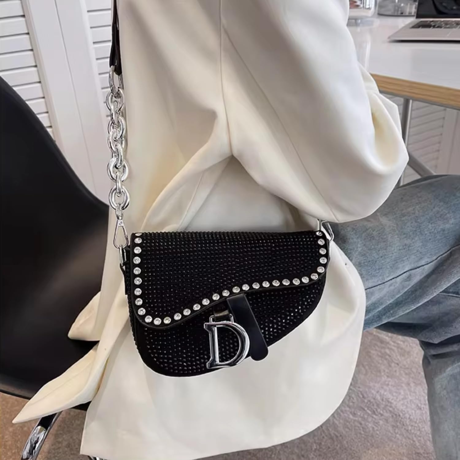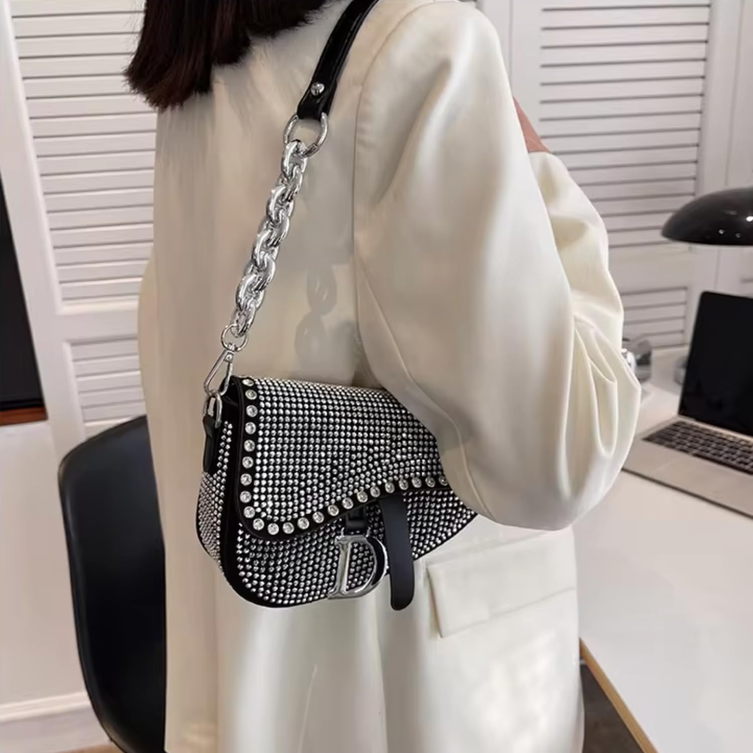 Elegant Design: Features sparkling rhinestones and a chic chain strap for a glamorous look.