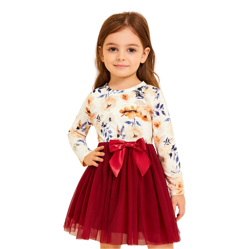 Baby Girls' Floral Long-Sleeve Dress with Tulle Skirt – Spring Dress G007