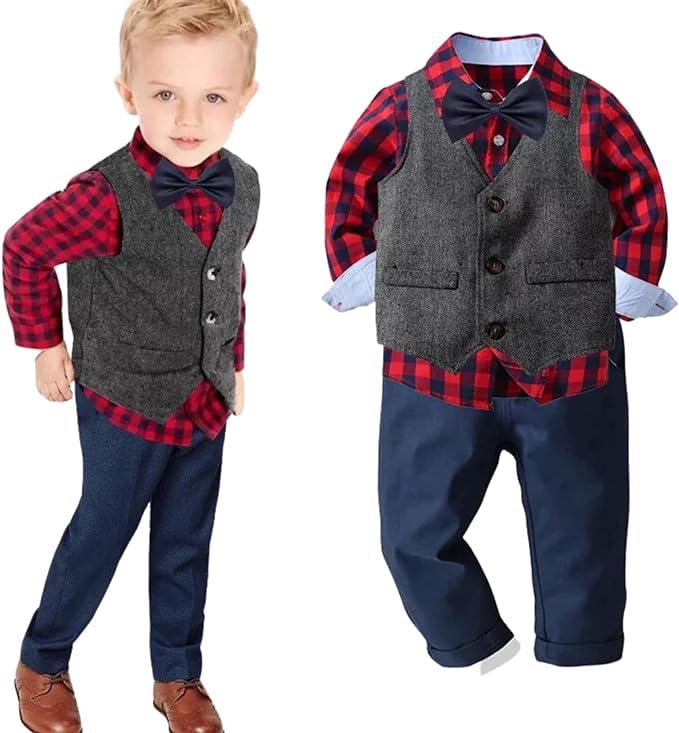 - Complete Outfit Set: Includes a long sleeve plaid shirt, jeans, suspenders, and a bow tie.