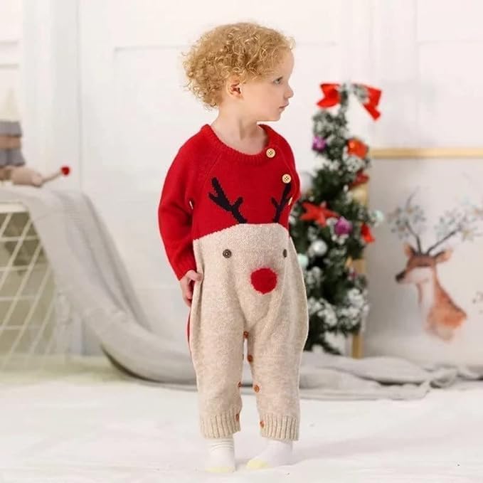 - Festive Design: Features a cozy knit romper with a charming reindeer face and antler details.