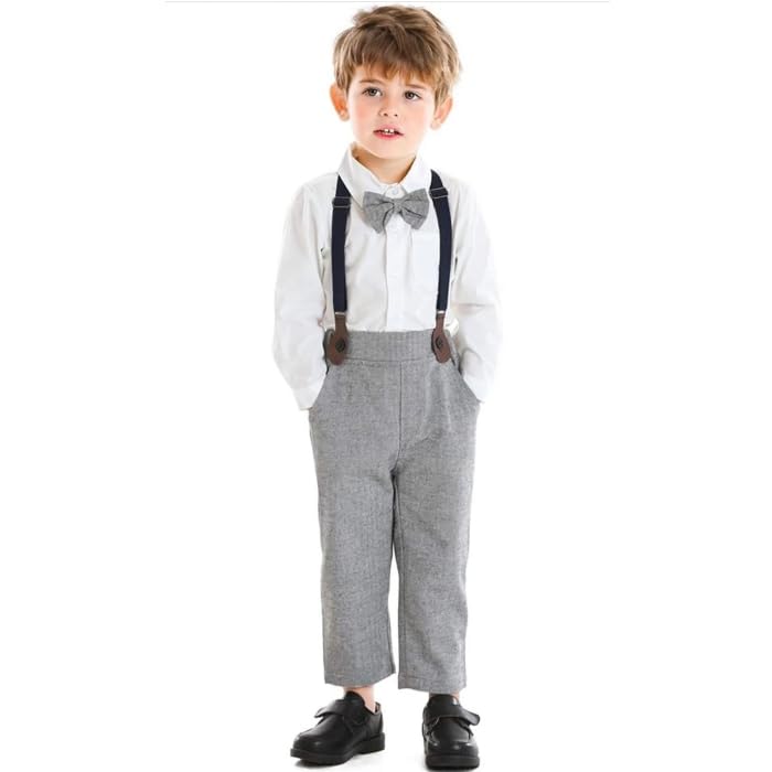 - Charming Design: Features a crisp white button-up shirt with gray pants, adjustable suspenders, and a matching gray bow tie.